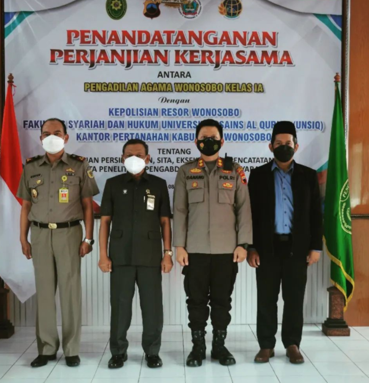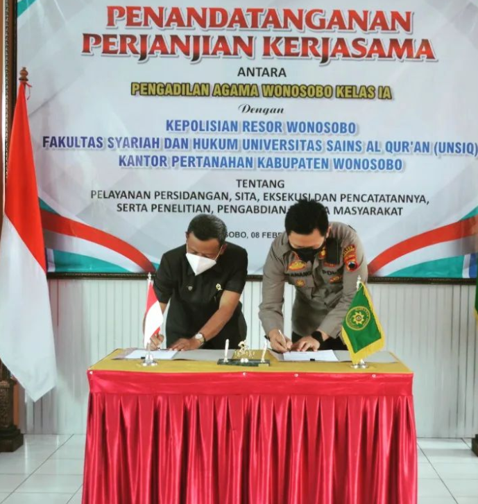 Pada hari Selasa, 08 Februari 2022, pelaksanaan Penandatangan Perjanjian Kerjasama Antara Pengadilan Agama Wonosobo dengan Kepolisian Resor Wonosobo, Fakultas Syariah dan Hukum Universitas Sains Al Qur'an (UNSIQ), Dan Kantor Pertanahan Kabupaten Wonosobo di gelar. Hadir pada acara tersebut Kapolres Wonosobo AKBP Ganang Nugroho Widhi, S.I.K., M.T., Kepala Kantor Pertanahan Kabupaten Wonosobo Siyamto, A.Ptnh., M.Si., Dr. Herman Sujarwo, S.H., M.H. Dekan Fakultas Syariah dan Hukum UNSIQ, dan Segenap Advokat/Pengacara. Acara ini merupakan tindak lanjut dari MoU Pengadilan Tinggi Agama Semarang dengan beberapa instansi terkait.