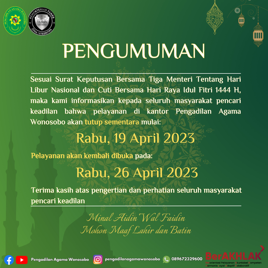 Sehubungan dengan Surat Keputusan Bersama Tiga Menteri tentang Hari Libur Nasional dan Cuti Bersama Hari Raya Idul Fitri 1444 H. Maka pelayanan di Kantor Pengadilan Agama Wonosobo mulai Rabu, 19 April 2023 libur/tutup dan akan melayani kembali pada Rabu, 26 April 2023. Terima kasih untuk perhatiannya